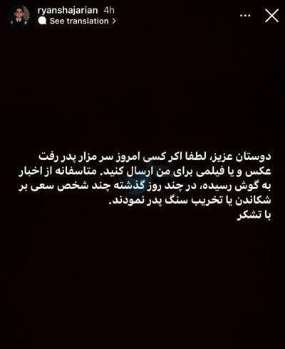 به گزارش سرویس منهای فوتبال؛ رایان، فرزند محمدرضا شجریان با انتشار یک استوری در اینستاگرام از احتمال تخریب سنگ قبر پدرش خبر داد.