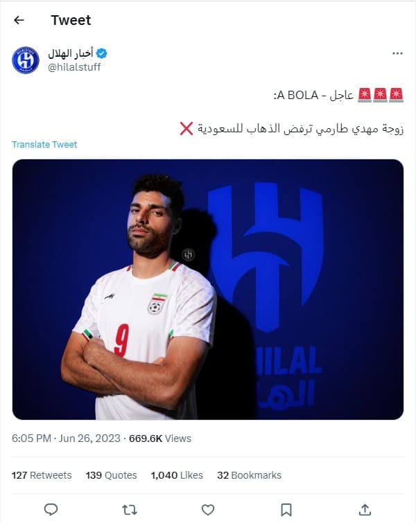 به گزارش دیلی فوتبال؛ رسانه خبری اخبار الهلال با انتشار پستی در توییتر از مخالفت همسر مهدی طارمی برای انتقال این بازیکن به عربستان سعودی خبر داد.
