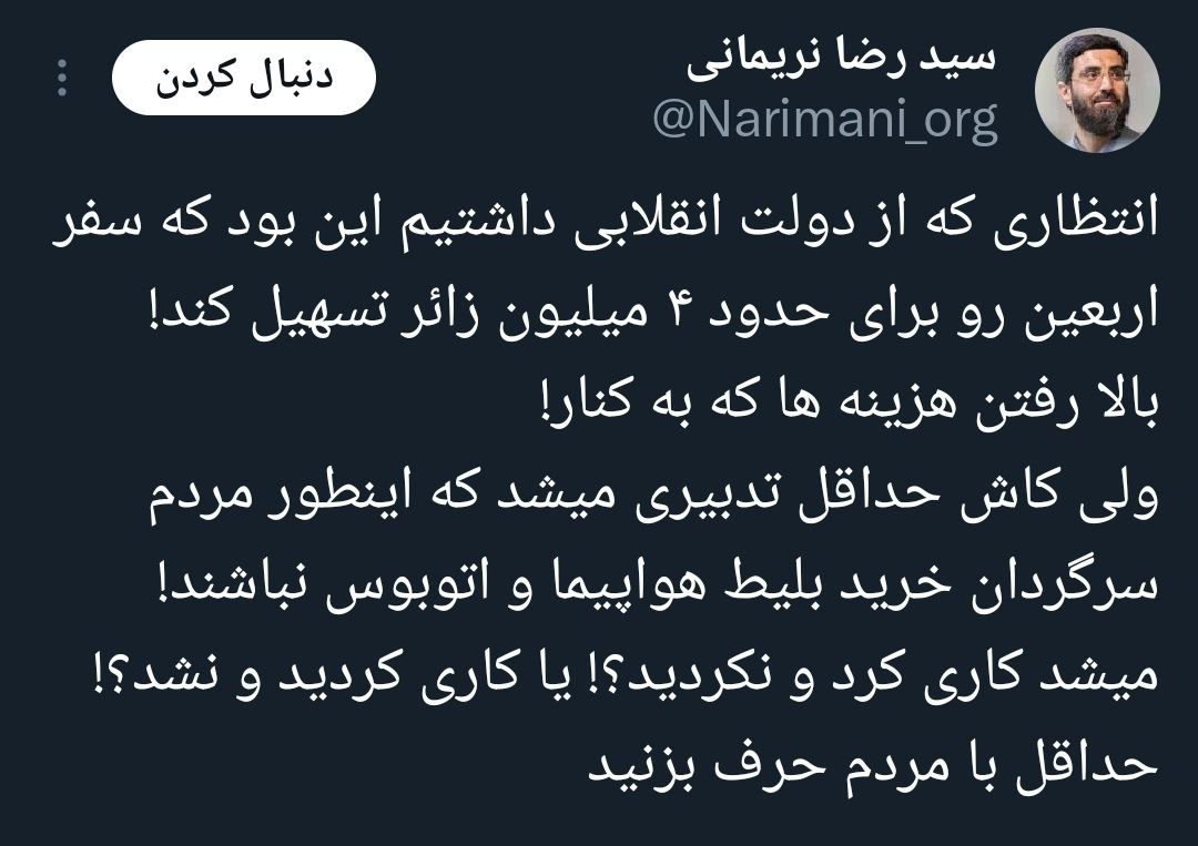 در این پست توییتری که رضا نریمانی در فضای مجازی به اشتراک گذاشته، این مداح معروف نوشته است: انتظاری که از دولت انقلابی داشتیم این بود که سفر اربعین را برای حدود ۴ میلیون زائر تسهیل کند.